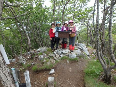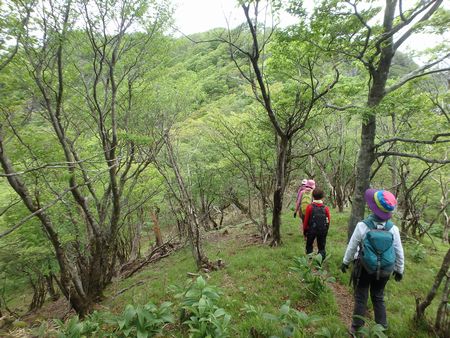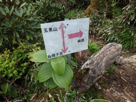| ▼五勇山・国見岳分岐・・・風が冷たいので早々に下山します | ▼バイケイソウの生える登山道 | |