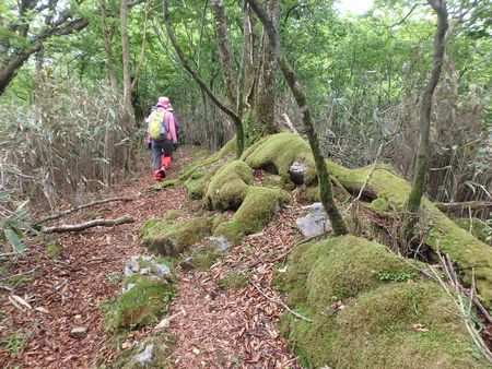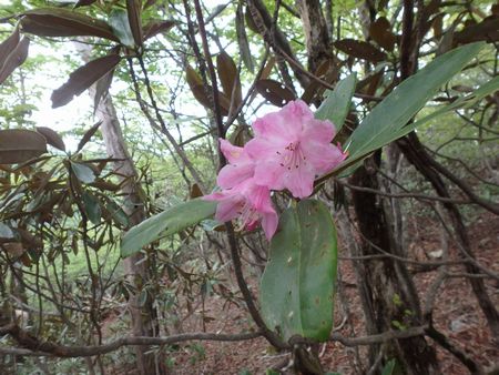 | ▼最高ピークをまいて三角点へ向います | ▼申し訳程度にシャクナゲの花がありました | |