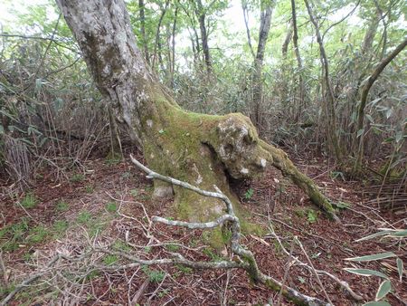 | ▼朽ちて土へ帰っていく樹木・・・もののけの世界です | ▼モミジですが、根元が物の怪の怪物に見えませんか | |