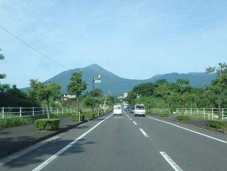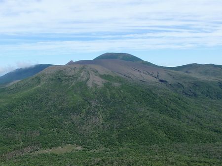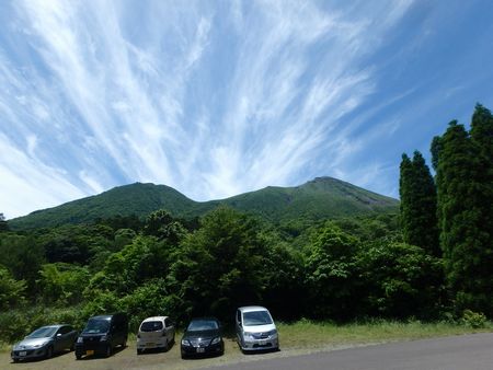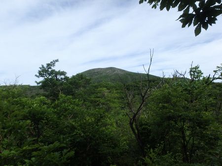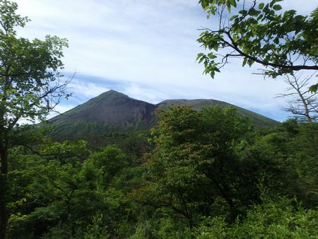 | ▼新緑の中を高千穂河原へ向けて歩きます。 | ▼左方に今から登る高千穂峰が見えてきました。 | |