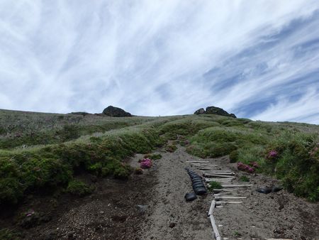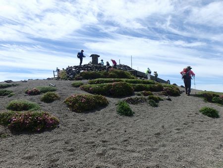 | ▼ミヤマキリシマを愛でながら登ります | ▼逆鉾の建つ高千穂峰山頂へ到着しました。 | |