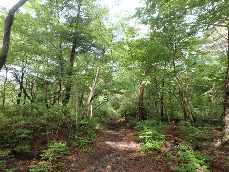 ▼柵止の林道を上がり途中から樹林帯を抜けて始発の登山口へ戻ります | |