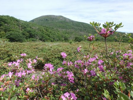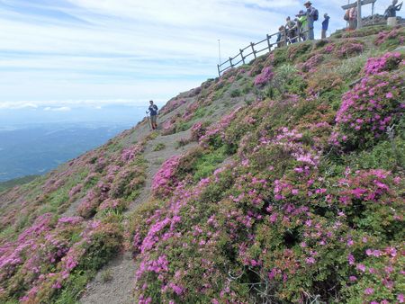 | ▼南斜面のミヤマキリシマ | ▼麓から見ると天を突くような山頂ですが、広々した山頂です。 | |