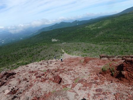 | ▼お鉢の急斜面ザレ場の急坂を登ります。 | ▼振り返ると、中岳-新燃岳-韓国岳が一直線に並んでいます。 | |