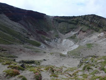 | ▼お鉢の縁部へ上がってきました〜奥に高千穂峰が見えます | ▼お鉢の火口底です。 | |
