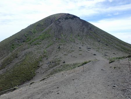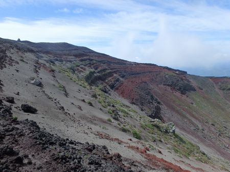 | ▼噴火の堆積物が縞模様になっています(お鉢) | ▼高千穂峰が近くなりました | |