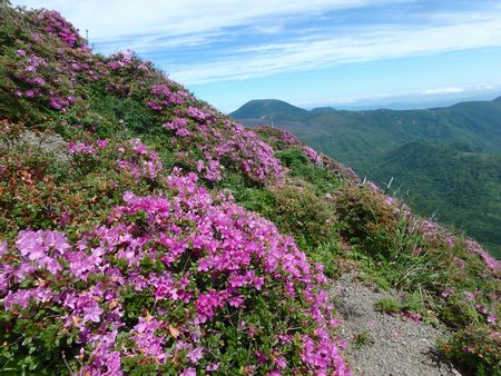 | ▼右方に、中岳(1332m)が見えてきました。 | ▼ミヤマキリシマの群生地から望む中岳 花のピークは終わりました(5月初旬〜中旬頃が見頃?) |