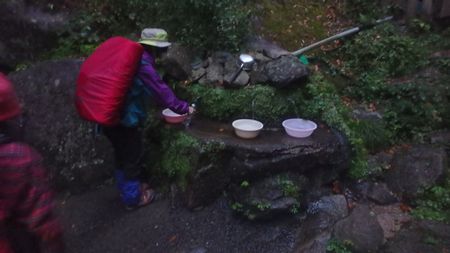 | ▼宝満山キャンプ場の朝 雨が上がり良かったです。 | ▼キャンプ場の水場へ寄ります | |