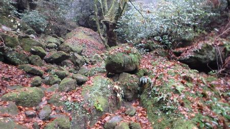 ▼「免の石」登山道の落ち葉 宮崎にも双石山や市房山にチョックストンが有りますね! |