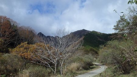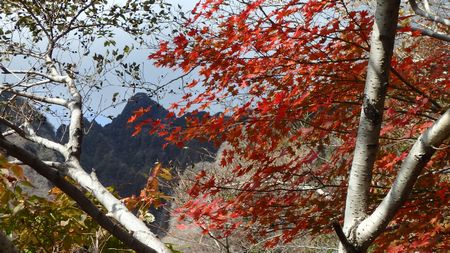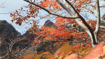 | ▼紅葉を愛でながら大戸尾根を下ります | ▼紅葉越しに天狗岩を望む | |
