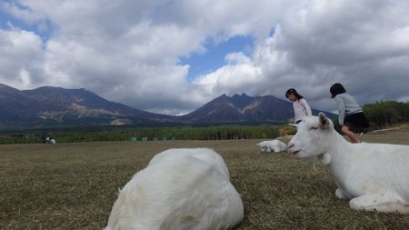 | ▼牧場道から振り返る、根子岳の天狗岩〜東峰 | ▼月廻り公園から望む阿蘇山(右方が根子岳) ヤギが放牧されていました メェ〜ェ♪ |