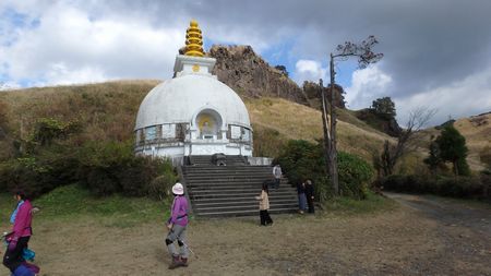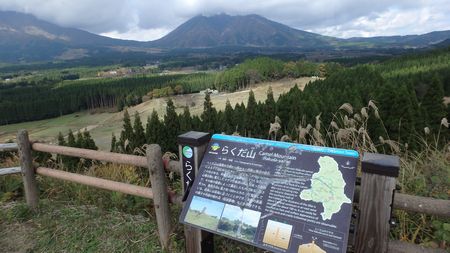 | ▼らくだ山の仏舎利塔 | ▼らくだ山から望む阿蘇、根子岳 | |