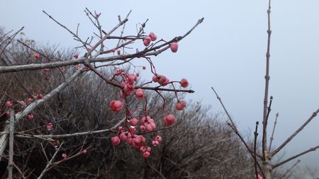 | ▼残る紅葉越しに天狗岩方面を眺望 | ▼東尾根コース別れのピンクの実はマユミでしょうか? | |
