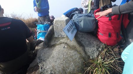 | ▼東峰が近くなりました | ▼大勢の登山者で賑わう、東峰の三角点です 山頂は狭いので展望の良い天狗岩稜線へ移動します |