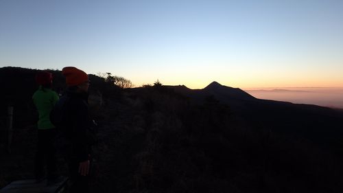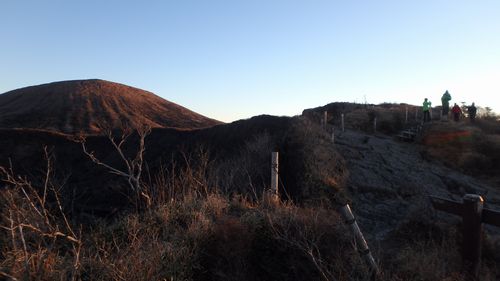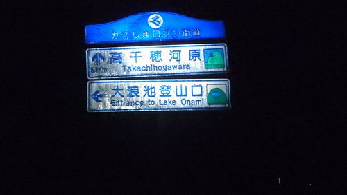 | ▼県道1号 大浪池登山口を午前6時に出発です | ▼大浪池避難小屋の縁部より望む韓国岳にはヘッドランプの灯が見えます。 | |