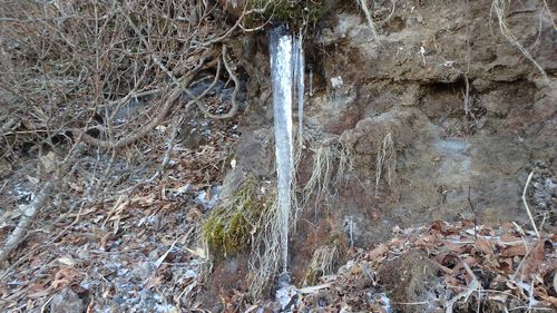 | ▼韓国岳の登山道には雪が残っています 木製階段が凍って滑るので注意! |