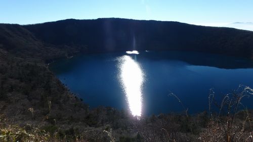 | ▼新春の陽光を映す大浪池の湖面(下山は西周りコース) | ▼始発の大浪池避難小屋ヶ所へ下りてきました。 (大浪池越しに韓国岳を望む) |