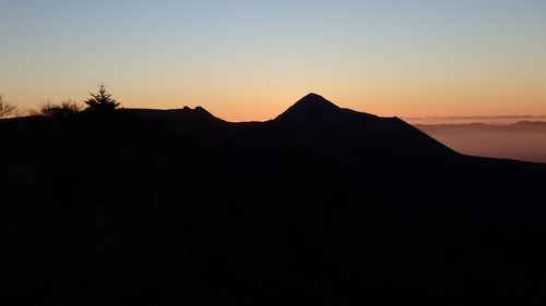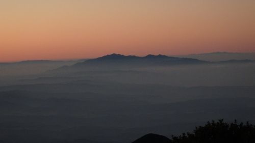 | ▼朝焼けの霧島山(新燃岳〜高千穂峰)・・・中岳は新燃岳に隠れます | ▼高隈山の全容が見えます (大箆柄岳から妻岳-双子岳-平岳-横岳-白山が見てとれます) |