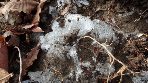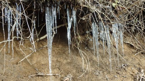 | ▼暖冬ですが霜柱が見られます | ▼登山道脇にツララが下がっています | |