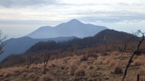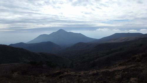 | ▼大幡山越しに、左から中岳〜新燃岳〜獅子戸岳 | ▼大幡山の火口越しに、冠雪の韓国岳と右後方に甑岳 | |