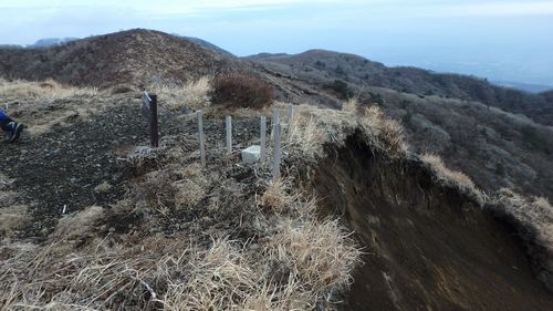 | ▼大幡山の三角点ヶ所から霧島高千穂峰 | ▼崩壊の進む大幡山山頂は、あと20cmほどで三角点が倒壊しそうです。 | |