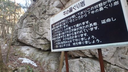 | ▼椎葉登山口より仰烏帽子山を目指します | ▼途中に「牛の鼻ぐり岩」・・・ウェスト制限有り(汗) 腹ばいにならないと通過出来ません・・・! |