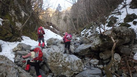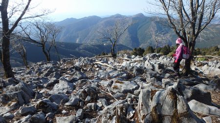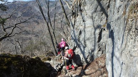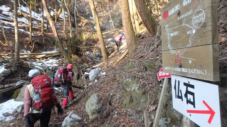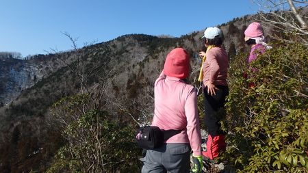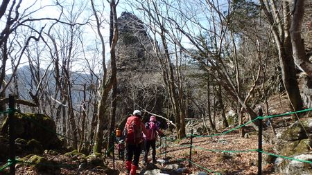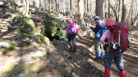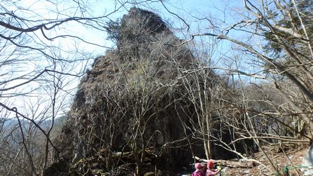 | ▼福寿草を愛でながら昼食後、椎葉へ下山します。 正面の岩峰は「仏石} |