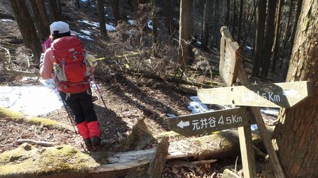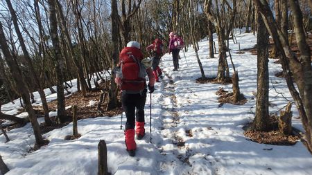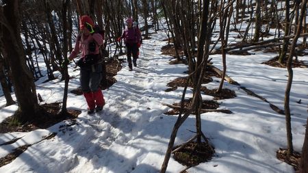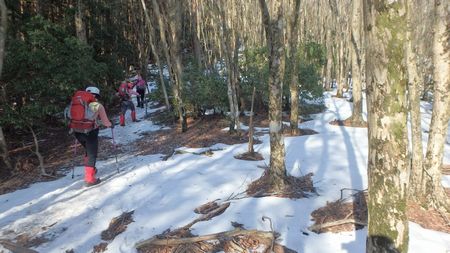 | ▼登ると雪が見えてきました | ▼仏石分岐を直進して、先ず仰烏帽子山頂を目指します | |