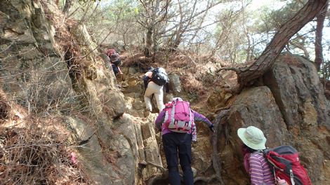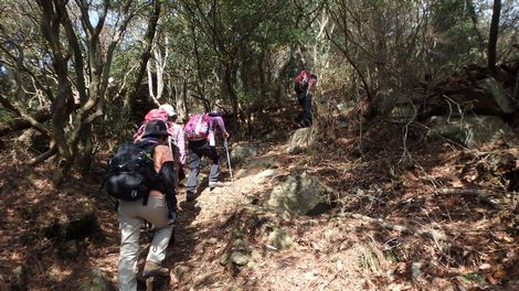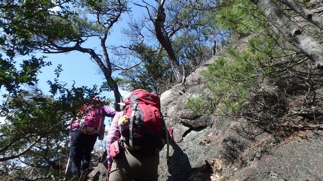 | ▼下部登山口からは岩場の連続する楽しいコースです | ▼609mピークに到着しました・・・ここから下って新穂高へ登り返します | |