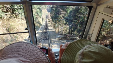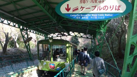 | ▼下りの角度は、スキーのジャンプ台と同じとアナウンスが有りました | ▼まやケーブル駅に到着しました(所要時間:5分) | |