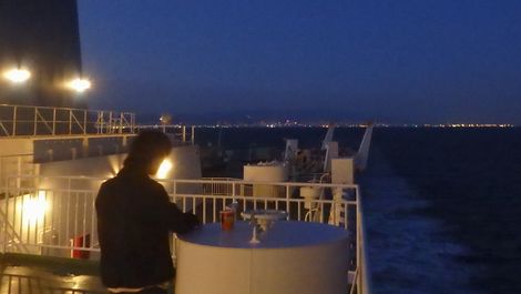 | ▼午後6時、出港です 展望風呂で汗を流しロビーデッキのテーブルに集合して乾杯です♪ |