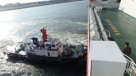 | ▼日にちは変わり前方に、宮崎のシーガイアが見えてきました | ▼狭い宮崎港はタグボートが活躍します。 90度方向転換して岩壁へ接岸させます |