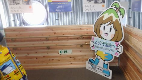 | ▼朝日に輝くフェリー甲板・・・間もなく下船できます。 | ▼下船時、エスカレーター降り口でお出迎え〜「ようこそ宮崎へ」 | |