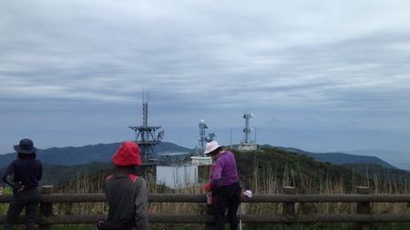 | ▼山頂からの眺望を楽しむ同行メンバーです♪ | ▼鹿児島県の高隈山(御岳〜大箆柄岳)が見えます | |