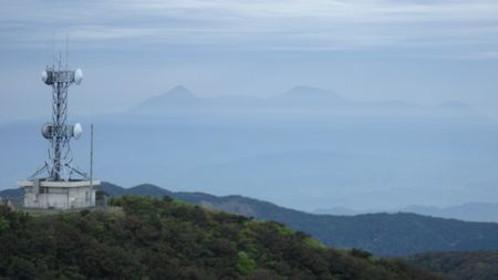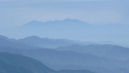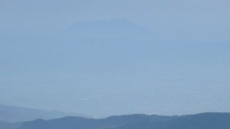 | ▼霧島山(高千穂峰〜韓国岳)が見えます | ▼都城盆地に先に、桜島が見えます 雲仙の普賢岳とおぼしき山影も見えていました〜♪ |