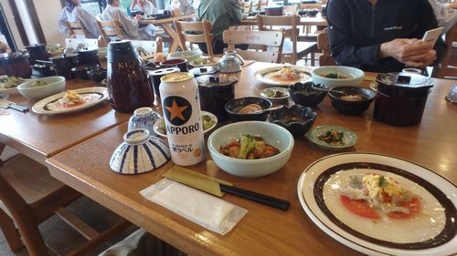 | ▼栂池ヒュッテの夕食です(1泊2食:\9,500) | ▼明るい感じの食堂で楽しく美味しく頂きま〜す♪ | |