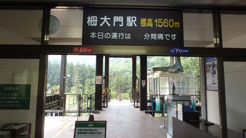 | ▼栂大門駅でゴンドラからロープウェイに乗り換えです | ▼下山するロープウェイとすれ違います | |