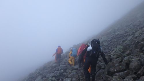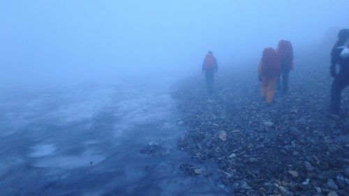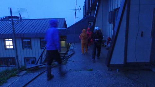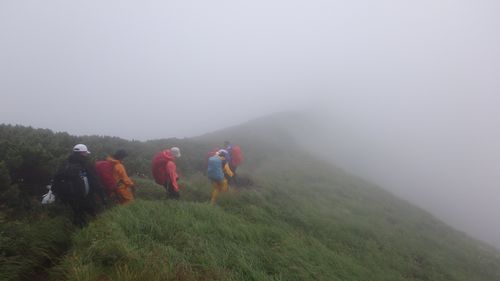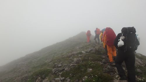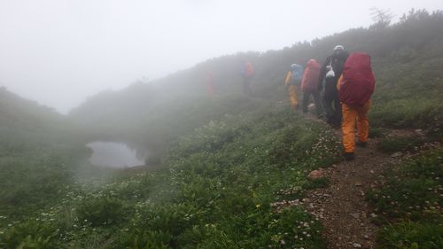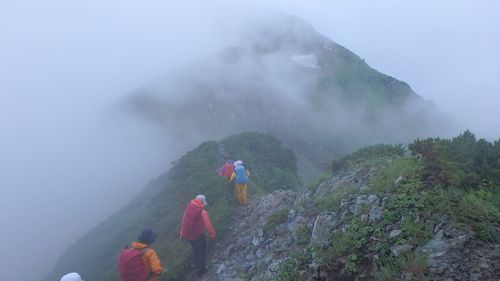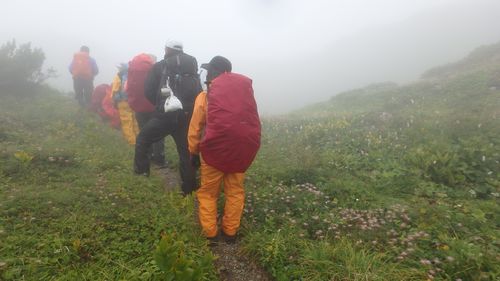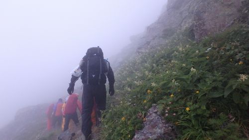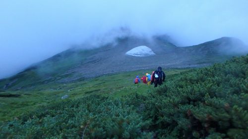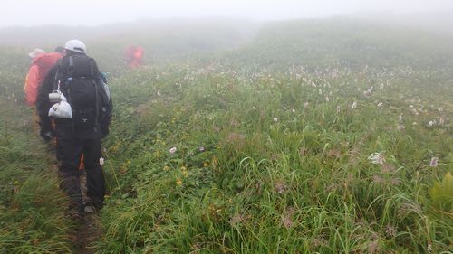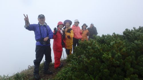 | ▼雨混じりの強風に、雨具を着けて宿を発ちます | ▼一瞬、ガスが晴れて旭岳の裾が見えました。 祖母谷ルートは、正面の雪渓付近を通過します。 |