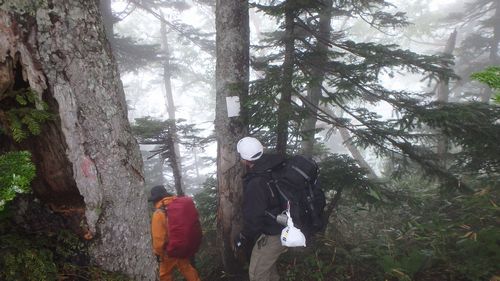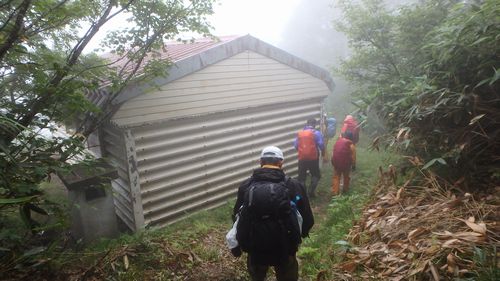 | ▼樹林帯を下ります | ▼不帰岳の避難小屋で休憩します | |