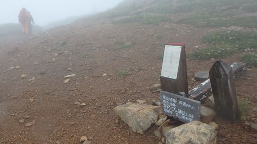 | ▼旭岳の雪渓脇を通過します | ▼旭岳の取り付き付近を通過しています・・・石板にペンキ記載の標識有 | |