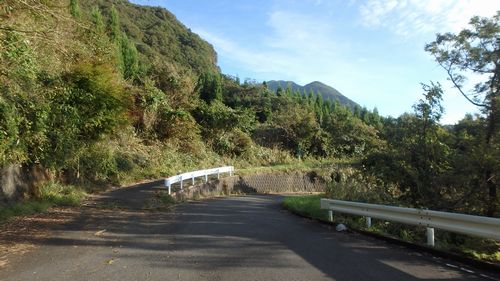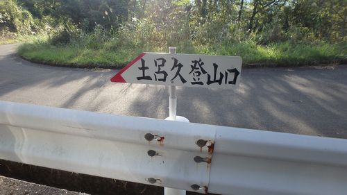 ▼ガードレールに土呂久登山口の標識が付いています。 岩戸から土呂久川沿いに土呂久・惣見地区を通過して上がるルートが最短 |
