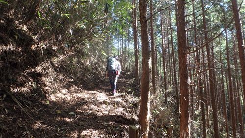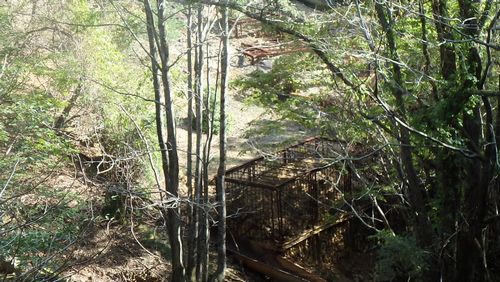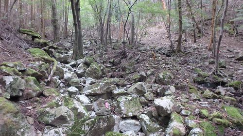 | ▼杉の植林帯を登ります。 | ▼右下に、鉱山跡地らしい施設の残骸?を見ます | |