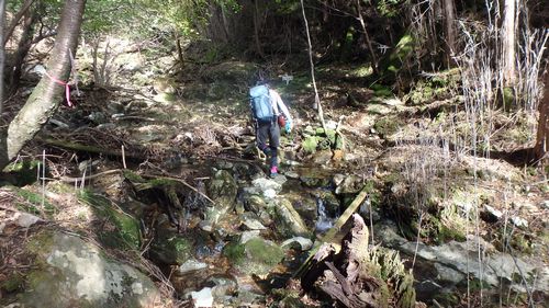 | ▼往路の自然林帯を下ります。 | ▼往路に通過した沢を再度渡ります。 | |
