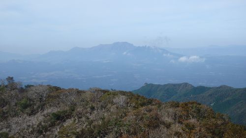 | ▼久留米からお越しの登山者の方にシャッターを押して頂きました(感謝!) | ▼当日の阿蘇山に噴煙は見えません(障子岳より) 九住連山から由布岳も見えました♪ |