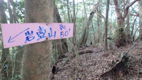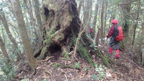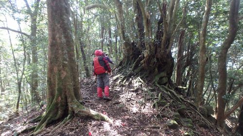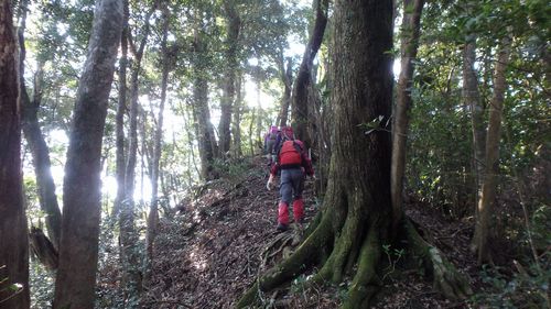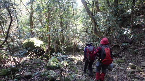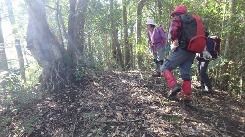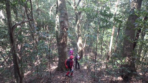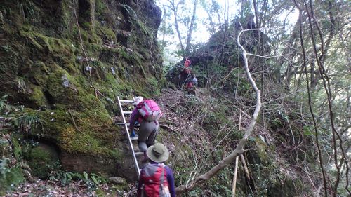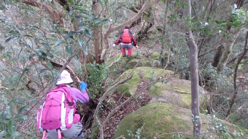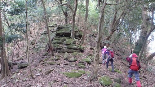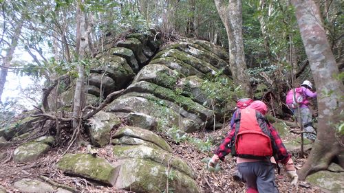 | ▼巨樹を見ながら花切〜岩壷山の稜線へ上がります。 | ▼滑り易い岩場です・・・ | |