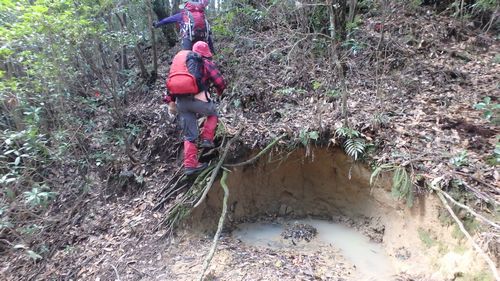 | ▼猪のヌタ場脇を登ります | ▼岩壷山山頂へ到着しました(昼食休憩) | |