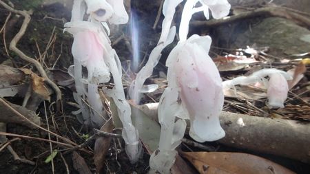 | ▼双石山の紅花ギンリョウソウ | ▼屏風岩ヶ所に咲く満開のヤマツツジ | |