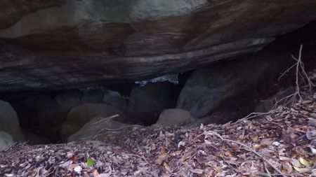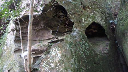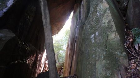 | ▼コオモリの寝床は・・・外出中〜下がっていませんね | ▼巨岩の隙間は憩いの空間♪ | |
