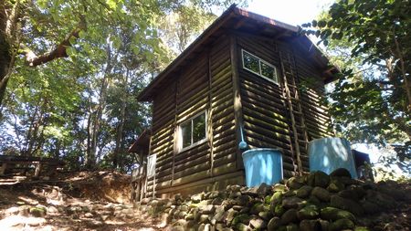 | ▼掃部岳山系の後方に西米良の石堂山が見えます | ▼双石山の山小屋(避難小屋)です | |