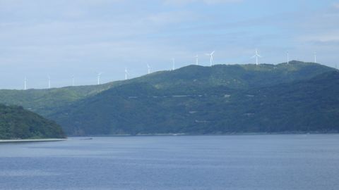 | ▼大分県臼杵からフェリーで四国の八幡浜へ渡ります。 | ▼八幡浜港が近くなると佐多岬半島に巨大な風車の林立が見られます。 | |